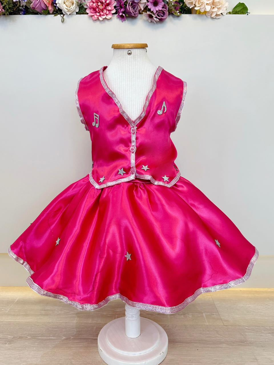 Lindo conjunto temático boiadeira, composto por colete com botões funcionais e saia godê, ambos confeccionados em tecido cetim com brilho suave e caimento leve. O conjunto possui acabamento em viés prateado e apliques em EVA de notas musicais e estrelinhas, que trazem um toque divertido e brilhante ao visual.