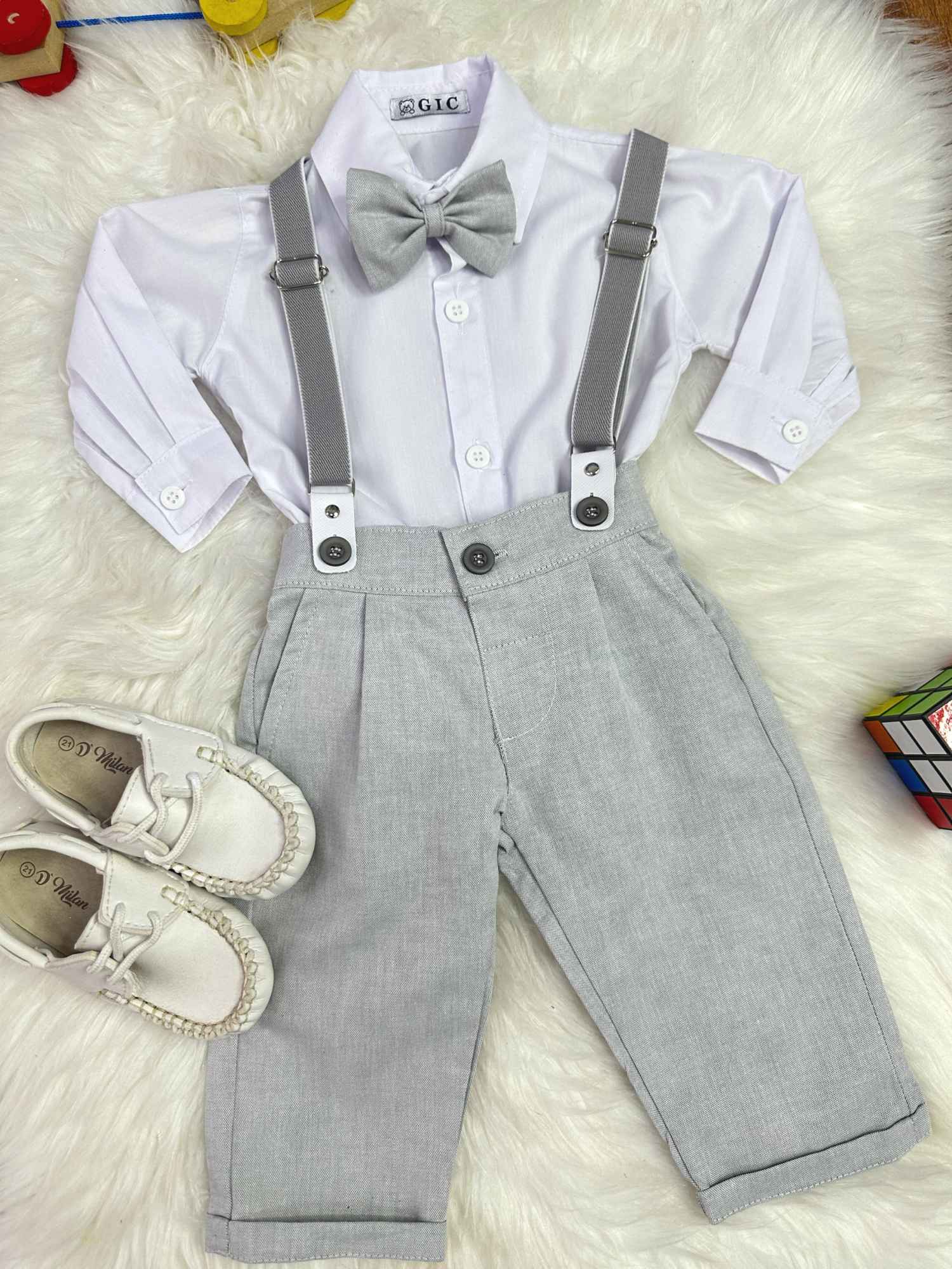 Conjunto Social Bebê Calça Susp. Cinza Claro e Camisa Branca