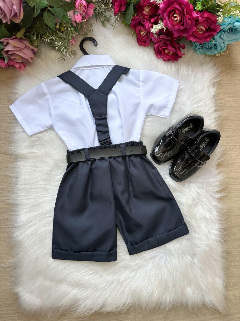 - Conjunto Completo: Inclui camisa social branca de manga curta, gravata azul marinho, short azul marinho, suspensório e cinto, todos combinando perfeitamente.