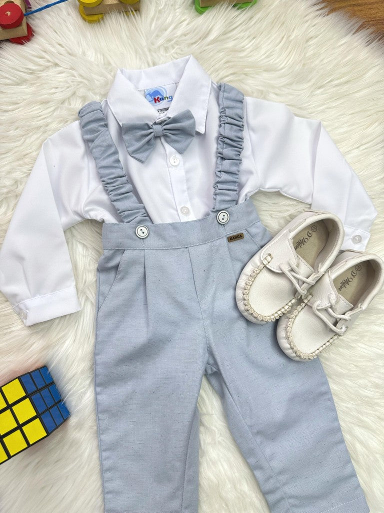 - Design Elegante: A camisa branca e a gravata azul adicionam um toque de classe, tornando seu filho o centro das atenções.