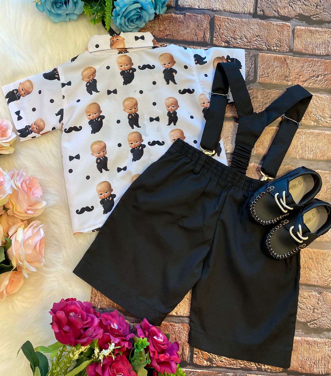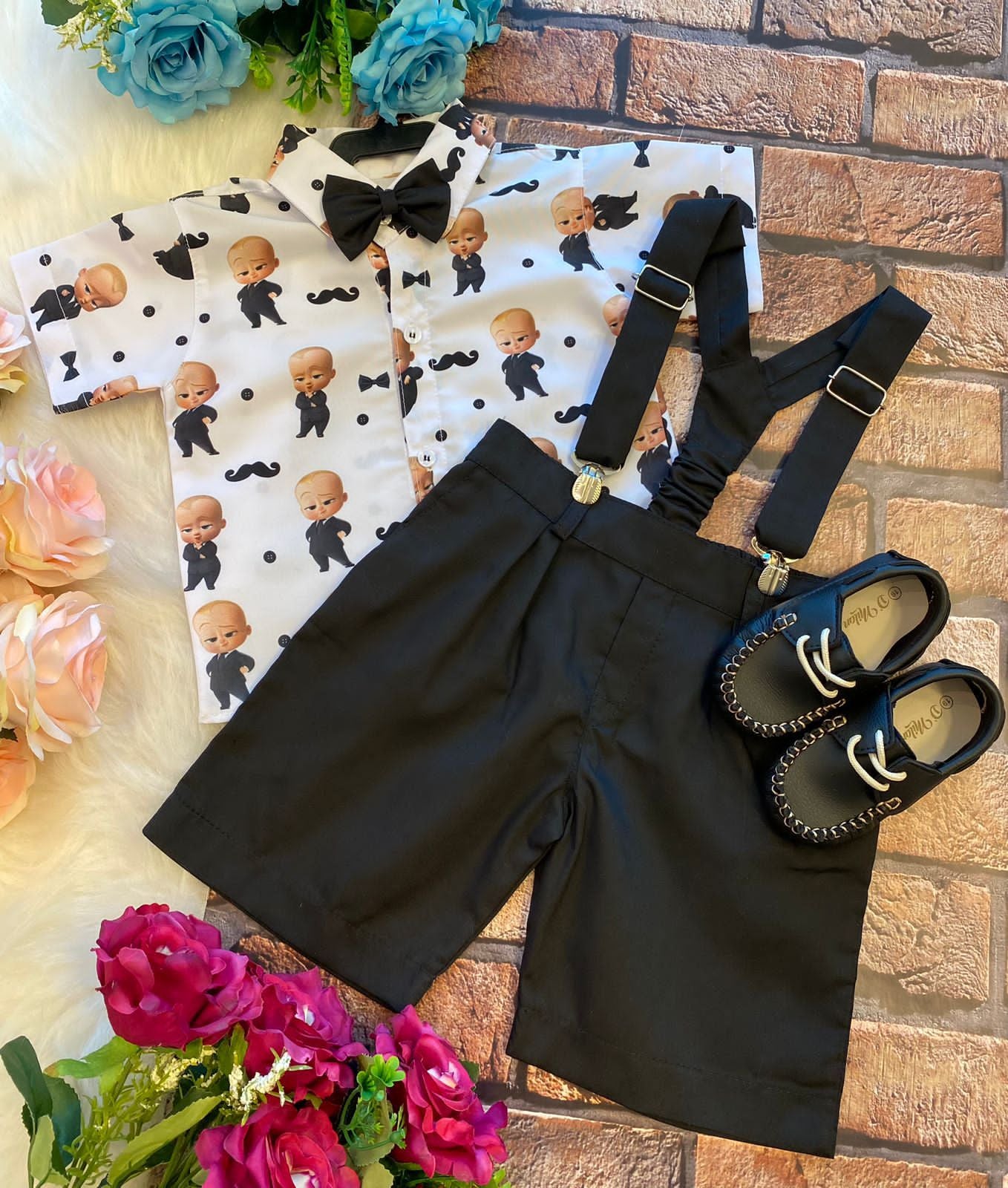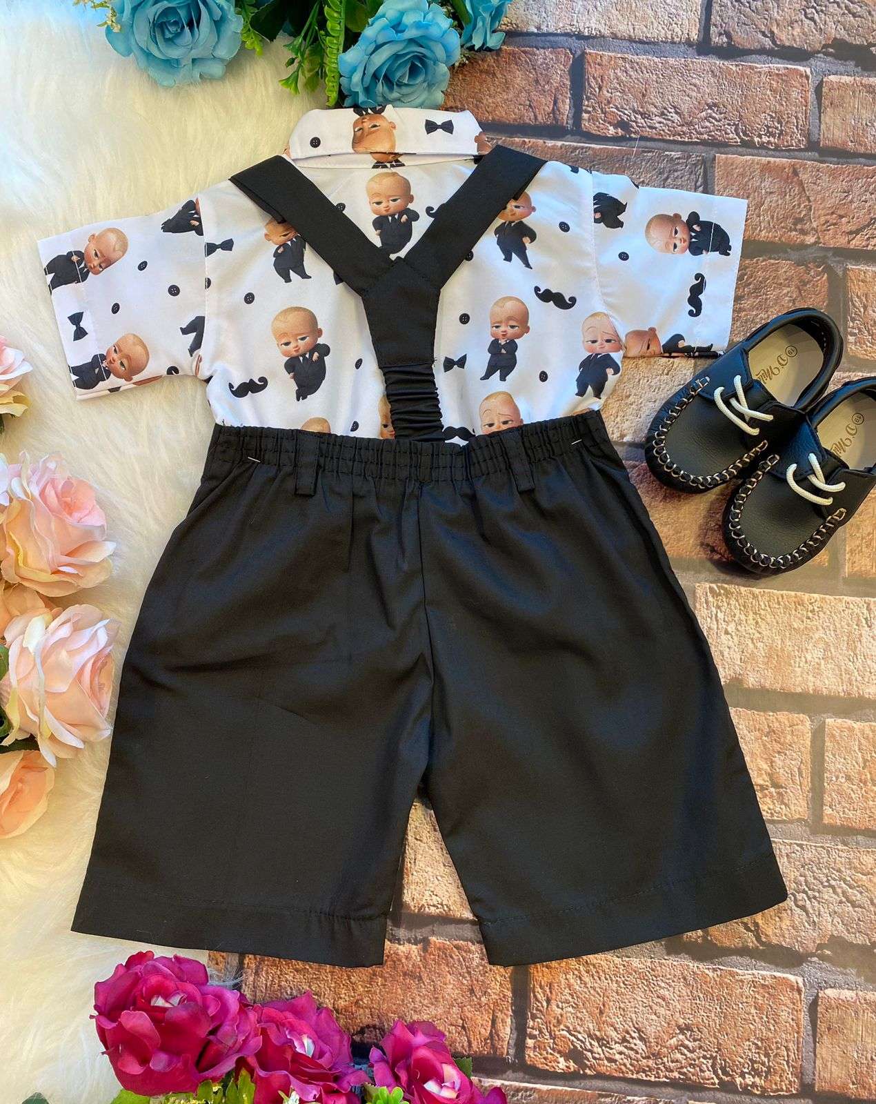 Conjunto composto por: Camisa Personagem, Shorts com suspensorio e gravata borboleta na cor Preta.
