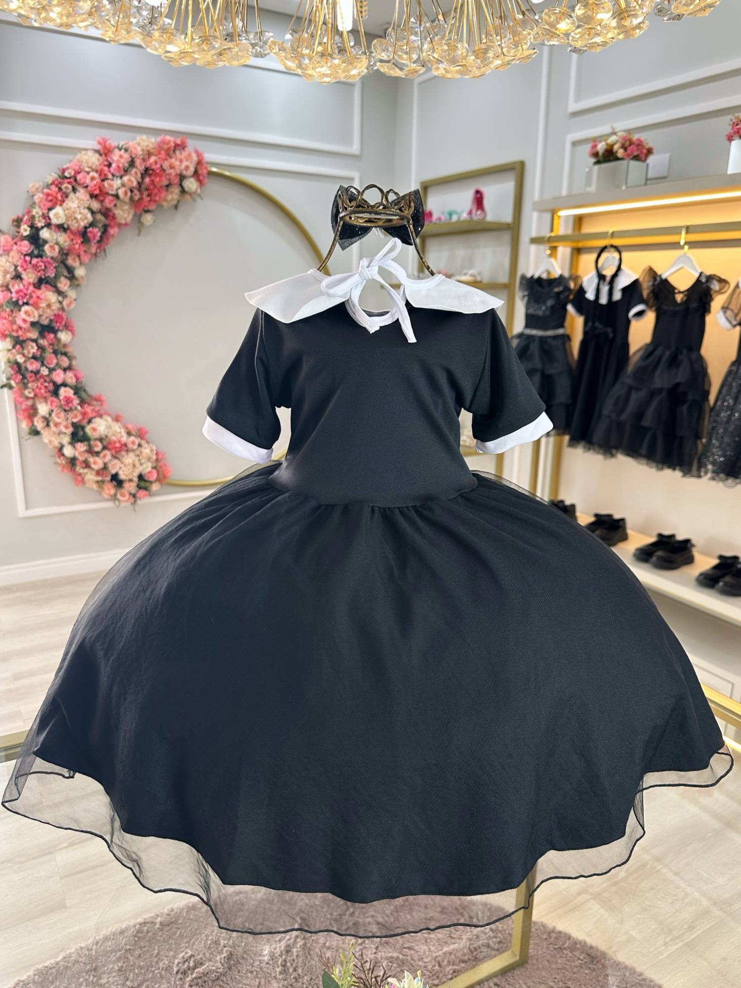 Essa peça é sucesso absoluto e o estoque é limitado. Garanta agora a fantasia que une personalidade, beleza e diversão. Sua pequena merece esse momento mágico com a Fantasia da Wandinha Com Laço Festas. Clique e compre já! 🛒✨