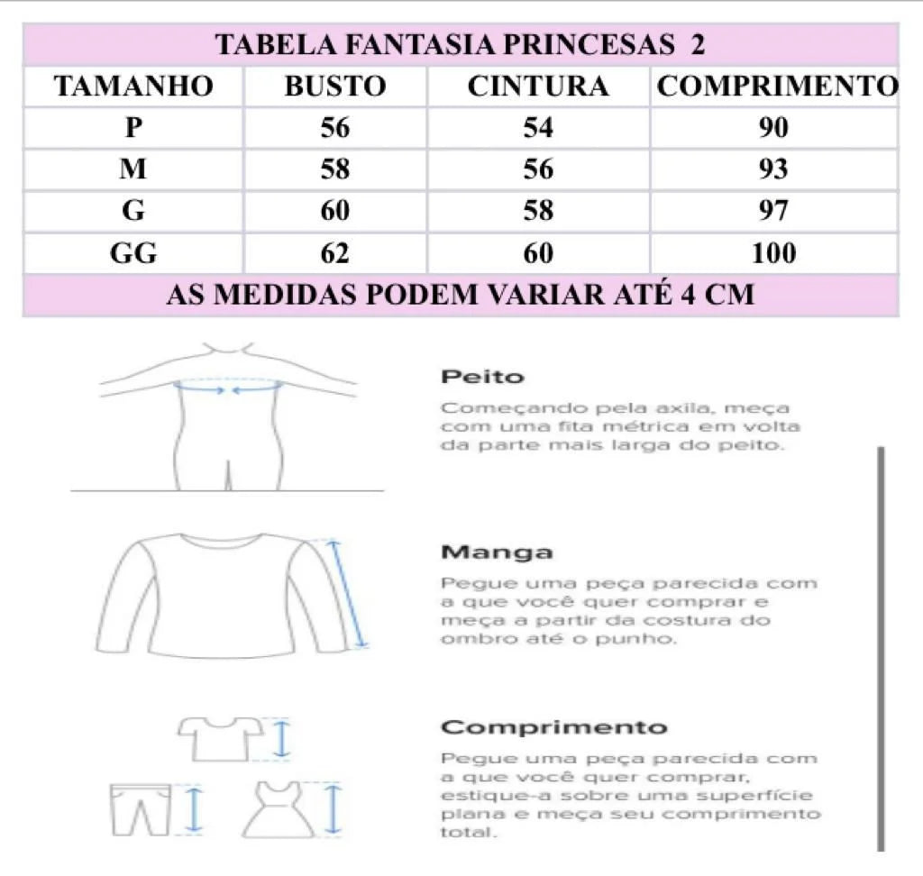 * Caso queira a fantasia mais armada, recomendamos o uso do saiote ou anágua de armação, disponível no nosso site na categoria acessórios.