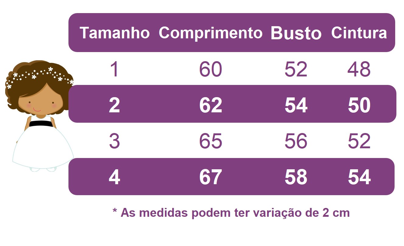 * Laço de cabelo, tiara e acessórios não acompanha o vestido e são vendidos separadamente;