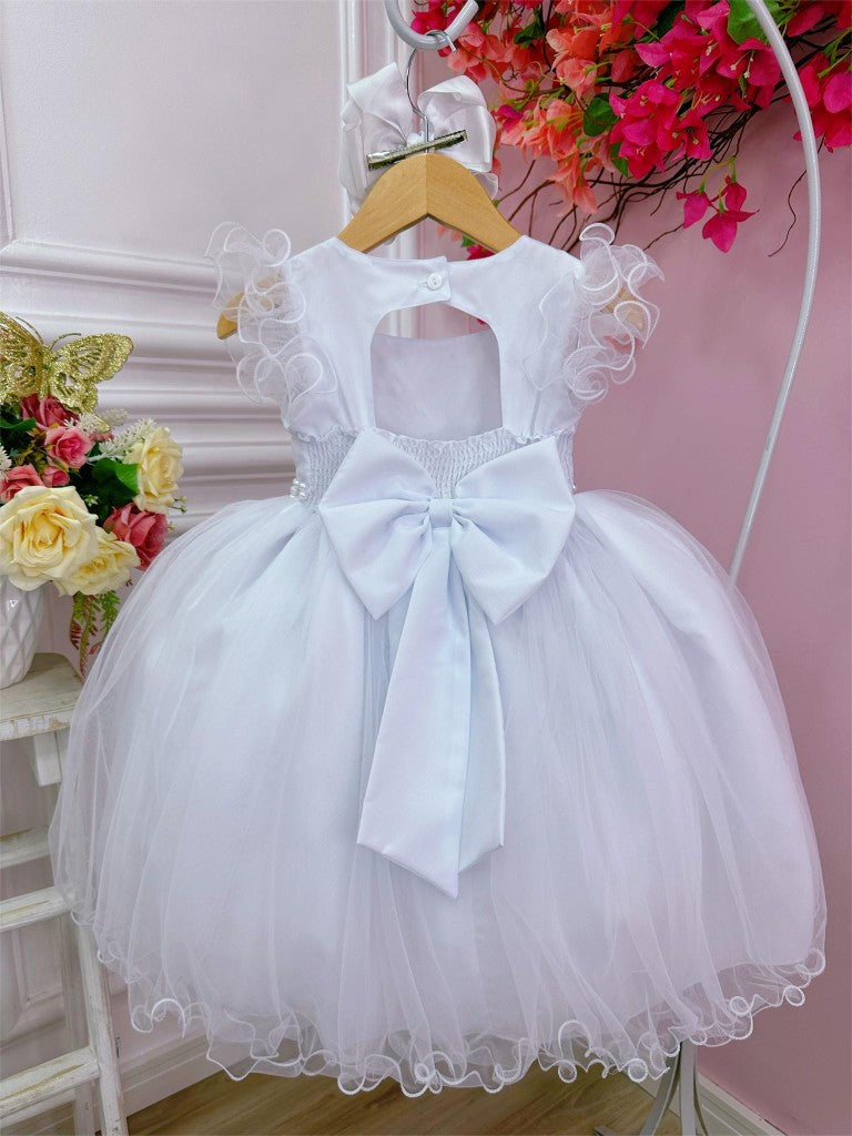 Vestido de Daminha Longo Branco com Strass no Busto e Cinto de Pérolas