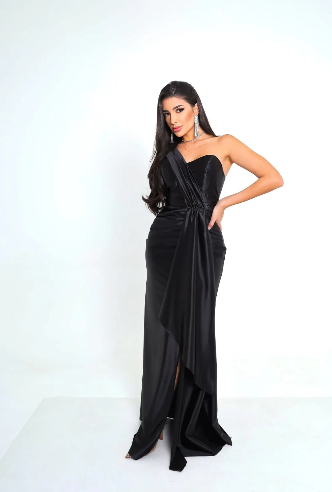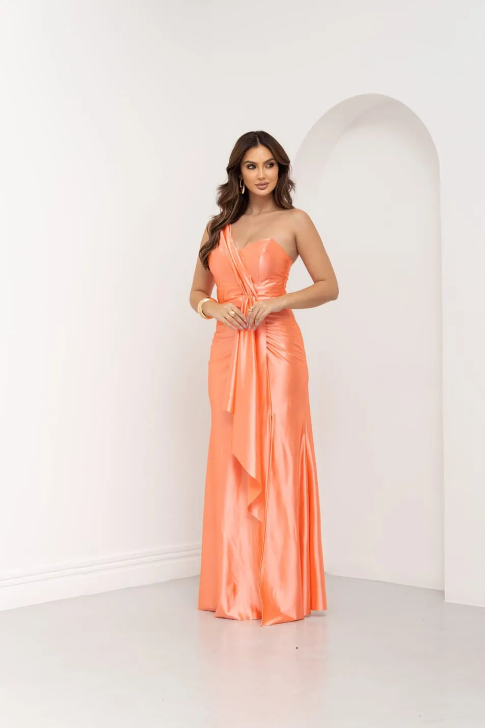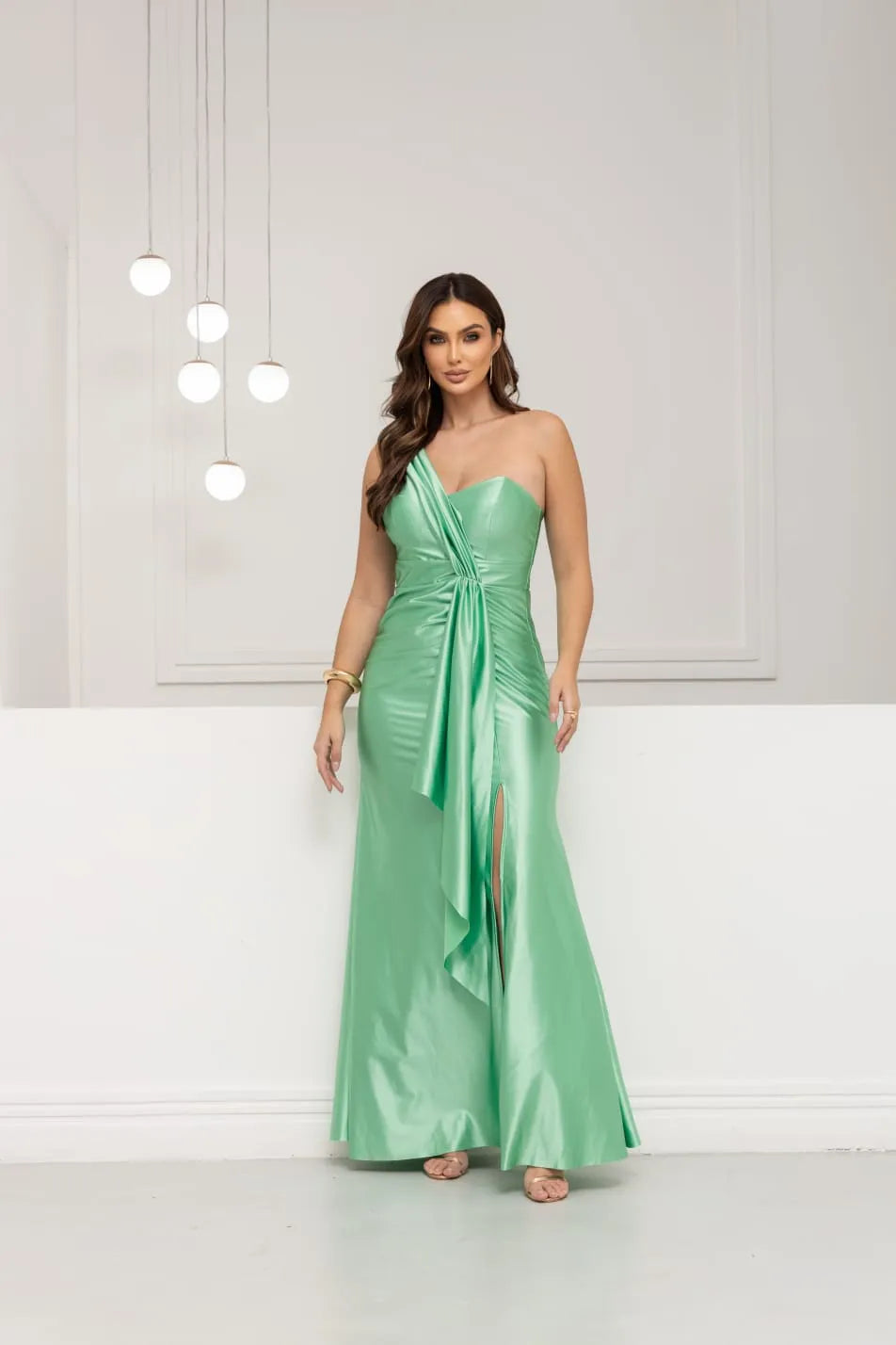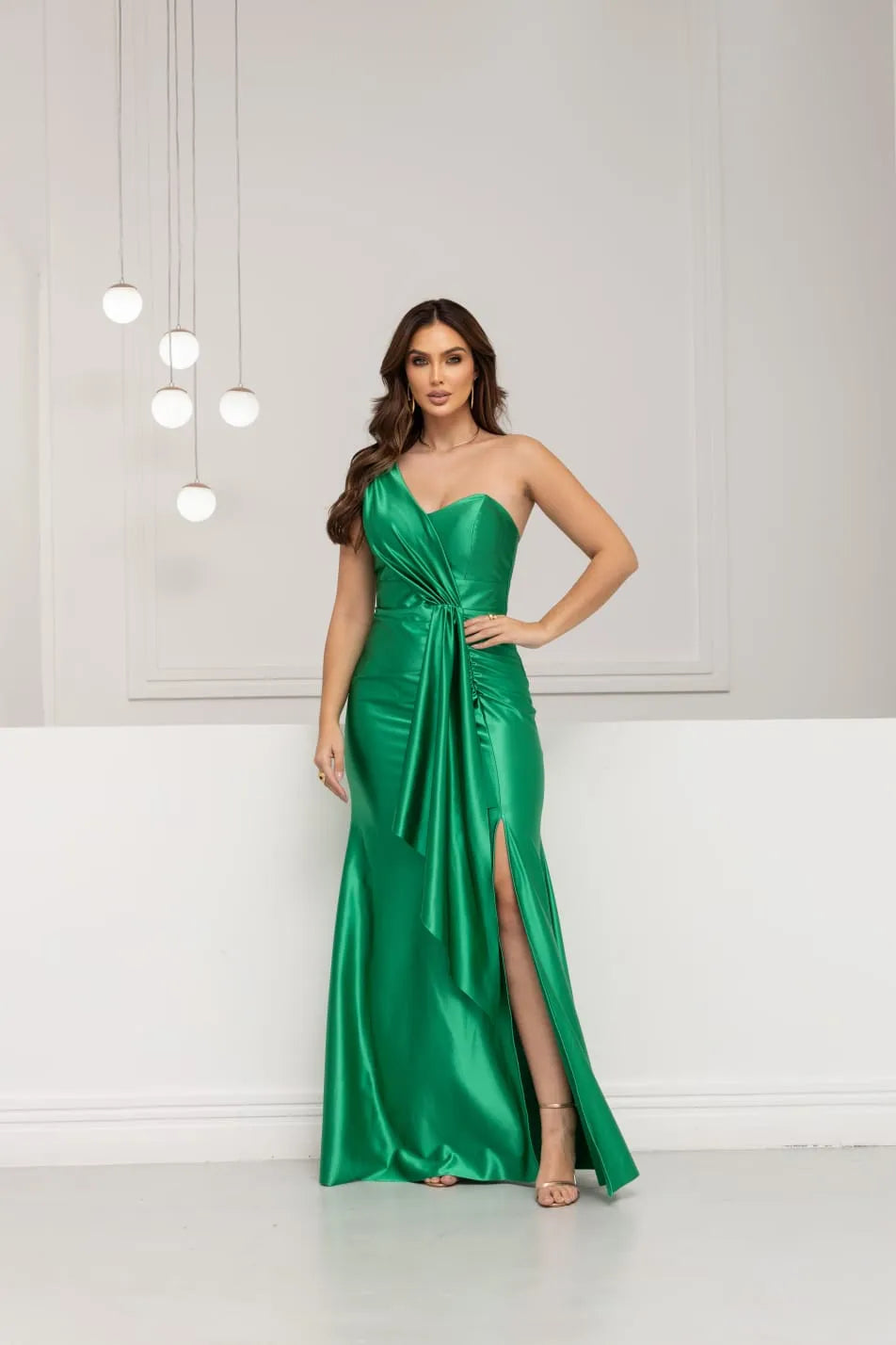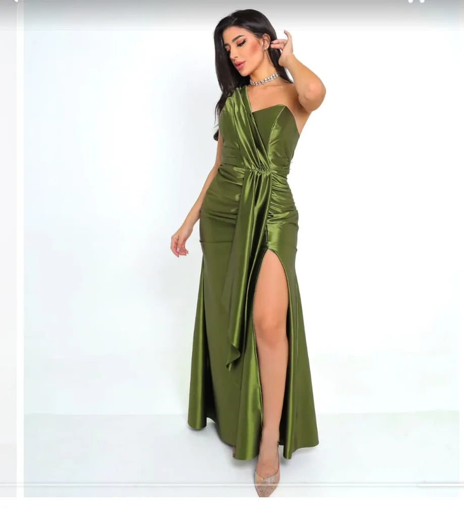 O Vestido de Festa Oliviane é a união perfeita entre sofisticação e ousadia. Confeccionado em tecido acetinado de brilho sutil, sua tonalidade verde oliva transmite elegância com personalidade. O design um ombro só e o drapeado frontal com cintura marcada criam uma silhueta escultural e refinada.