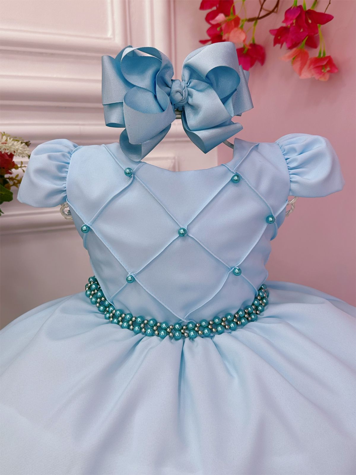Vestido Infantil Azul Bebê em Cetim com Peito Nervuras e Cinto de Pérolas para Festa de Aniversário