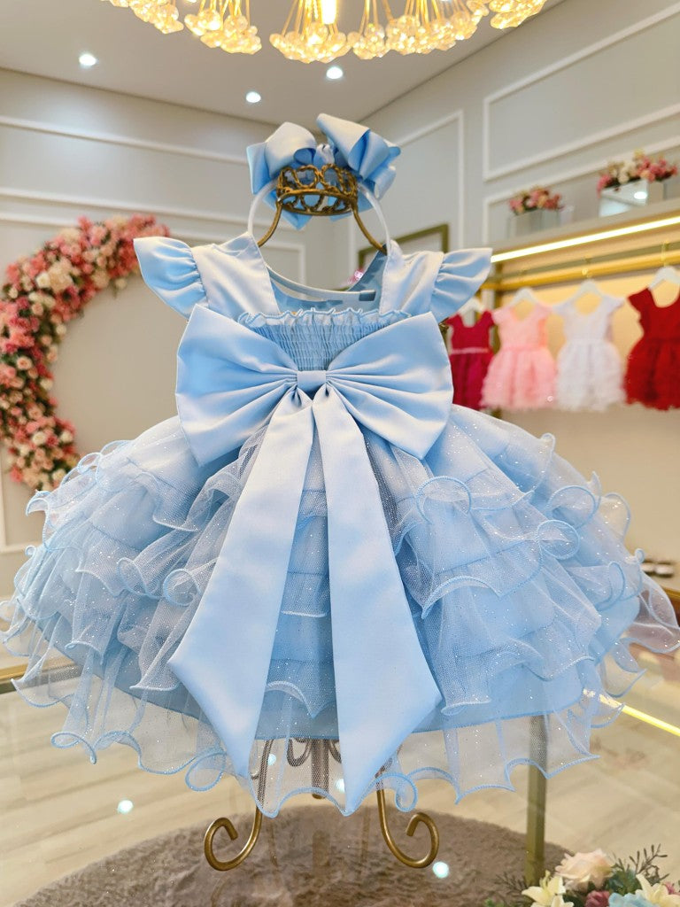 Vestido Infantil Azul Claro em Cetim com Saia com Babados Luxo para Batizado