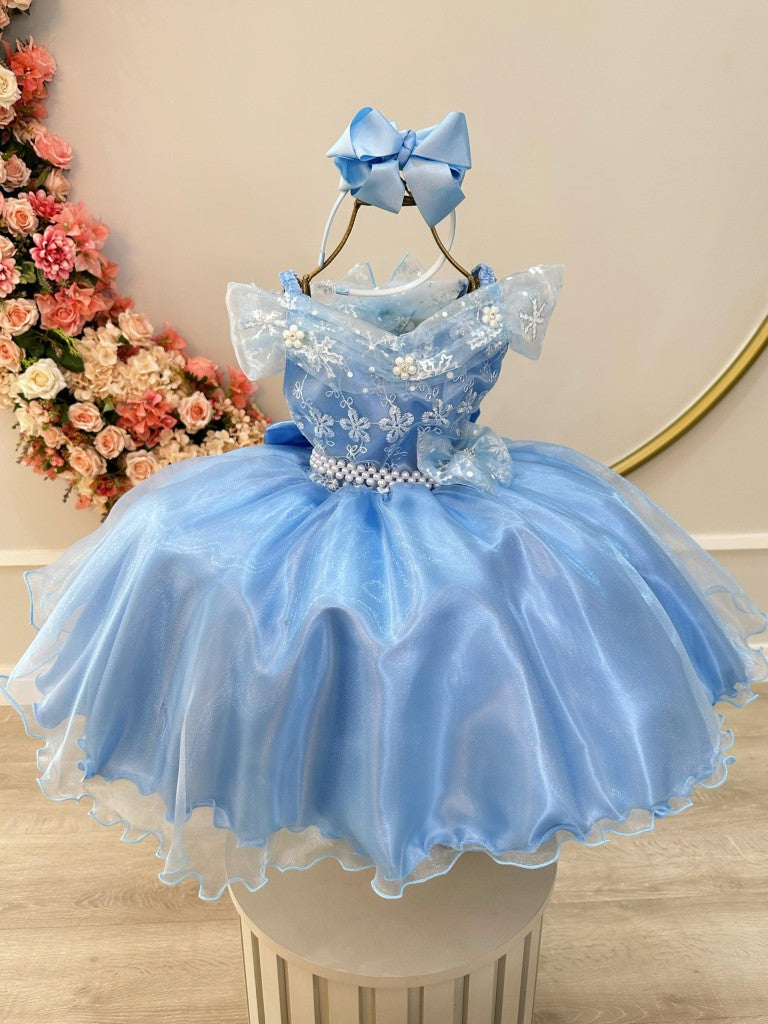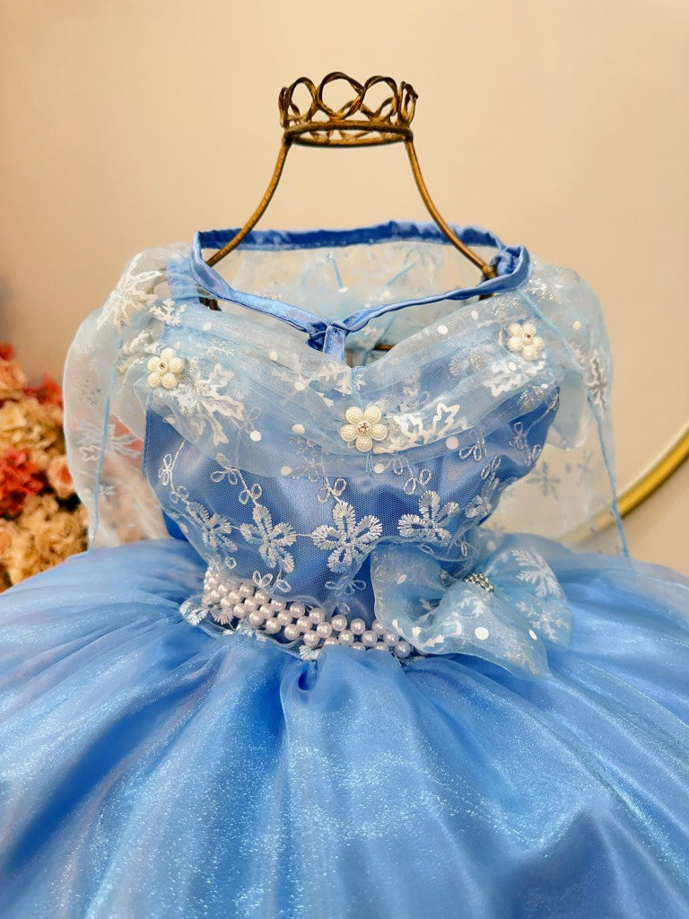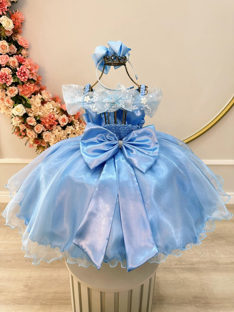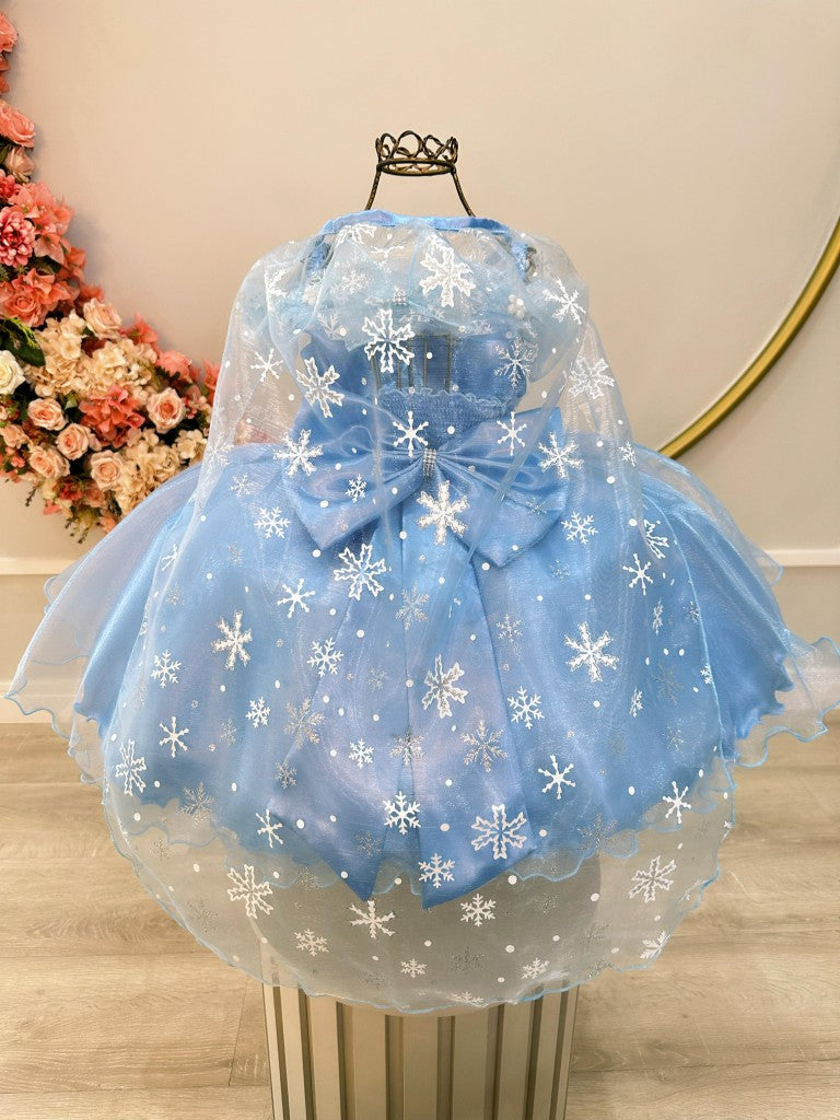 Vestido Infantil Azul em Cetim com Capa Luxuosa e Saia Rodada para Festa de Aniversário