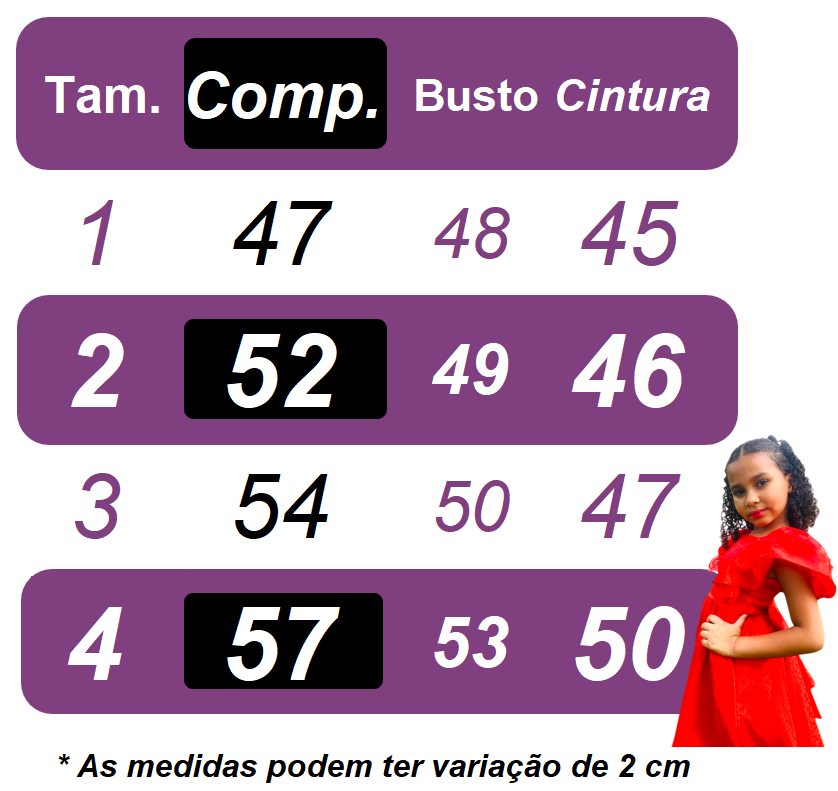 Perfeito para meninas em festas de aniversário, casamentos ou encontros familiares, este vestido é uma escolha segura para ocasiões especiais. Lembre-se de que a customização das medidas não é possível, então, compare as medidas da criança com a tabela disponível nas fotos antes de comprar. Para um look armado como nas fotos, sugerimos usar uma anágua (saiote), disponível separadamente.