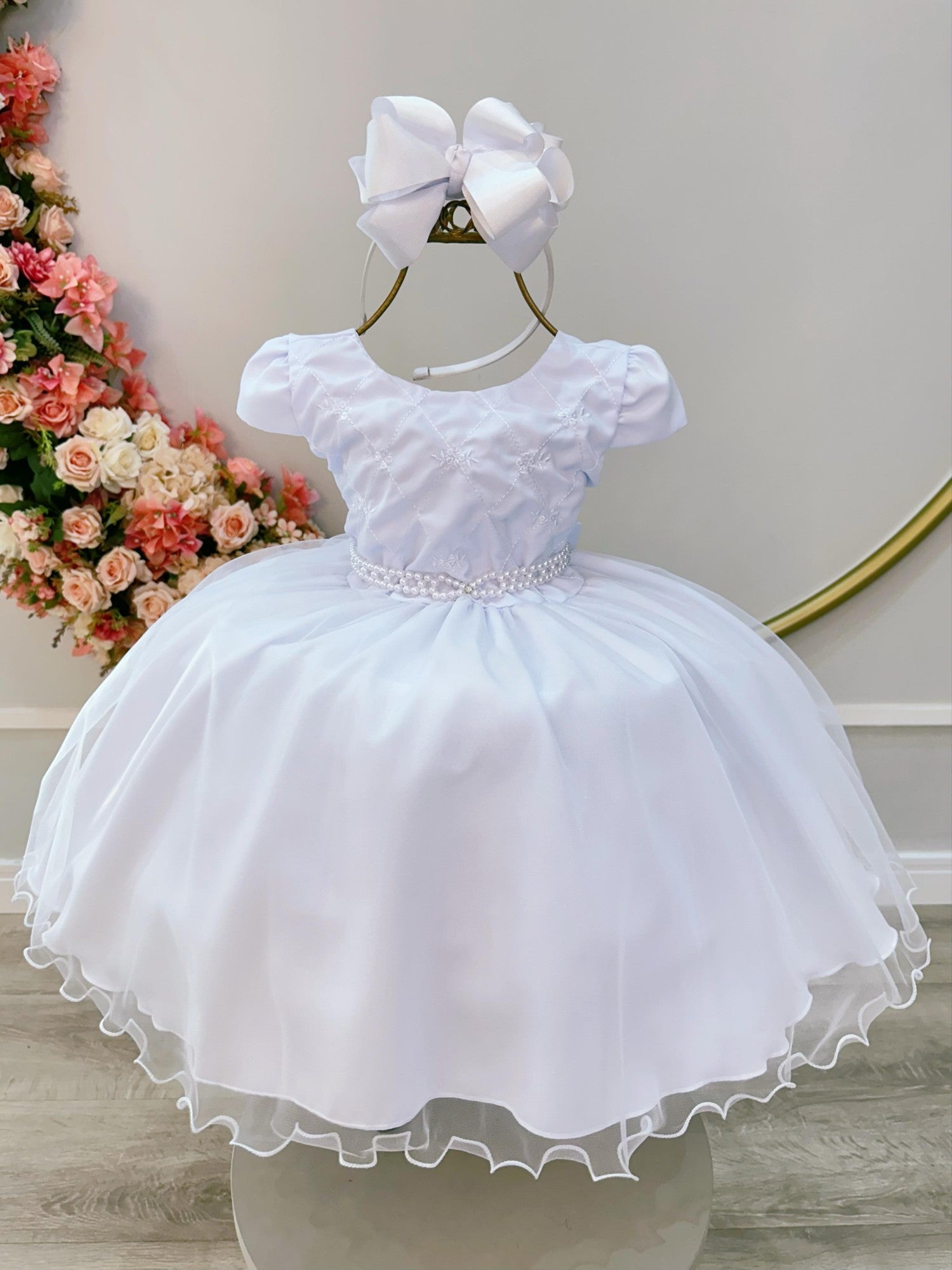 Vestido Infantil Branco Busto C/ Bordado Flores Daminha Festa