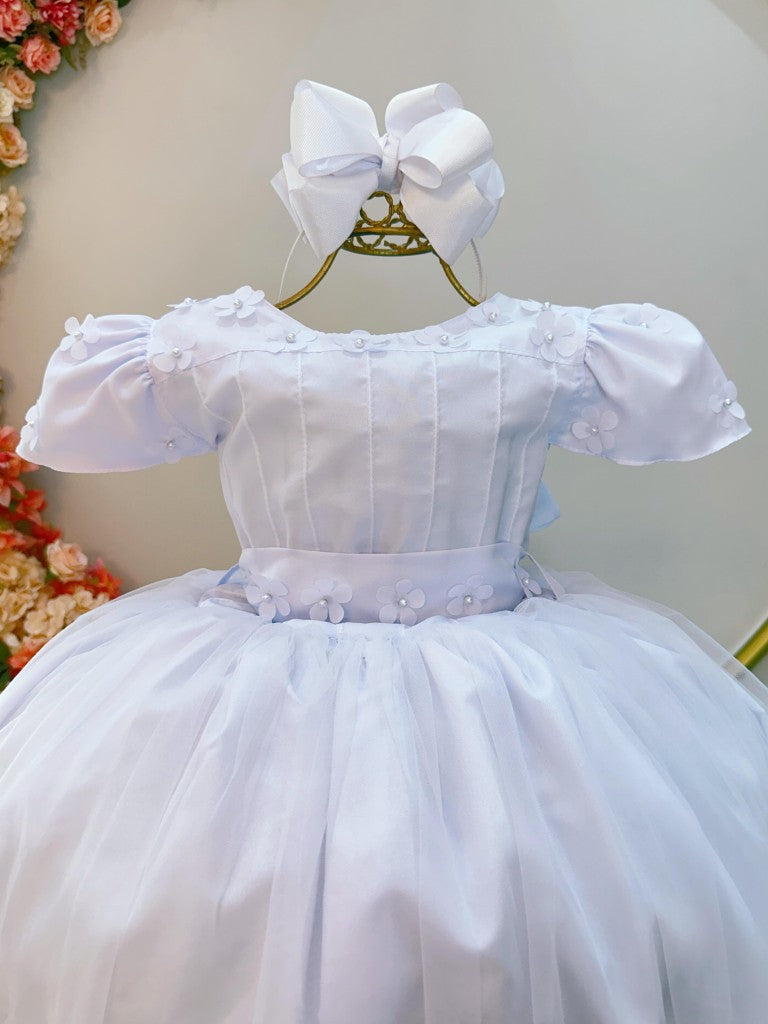 Vestido Infantil Branco em Tule com Apliques Saia Rodada para Daminhas