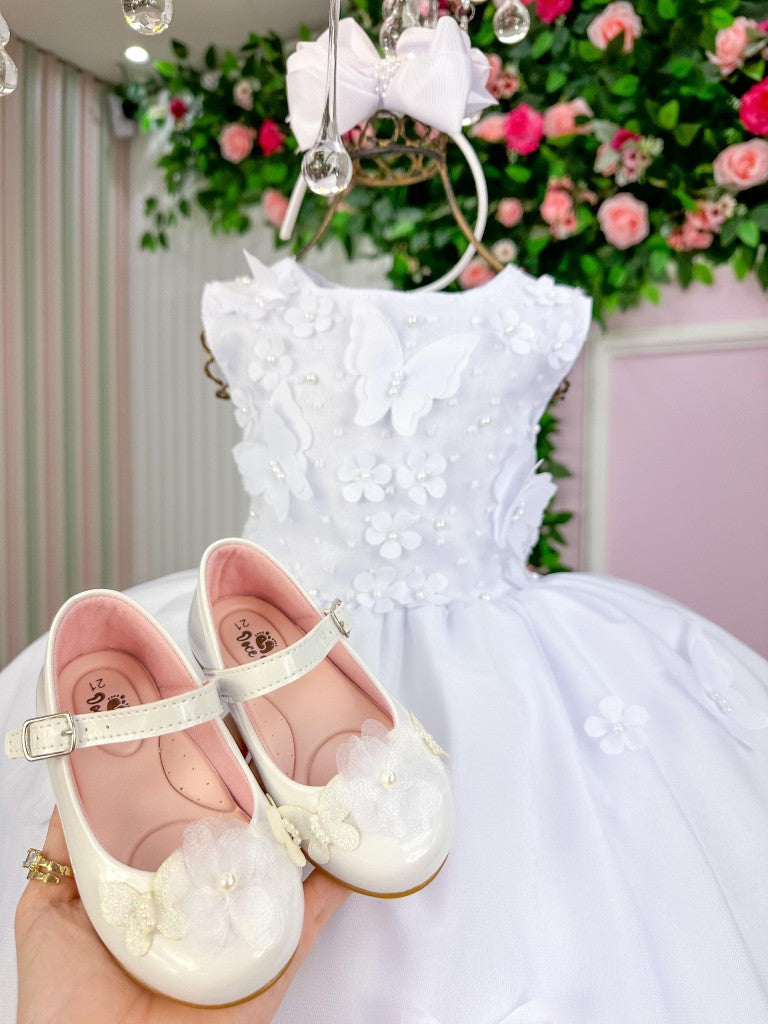 Vestido Infantil Branco em Tule com Renda e Saia Rodada para Daminhas