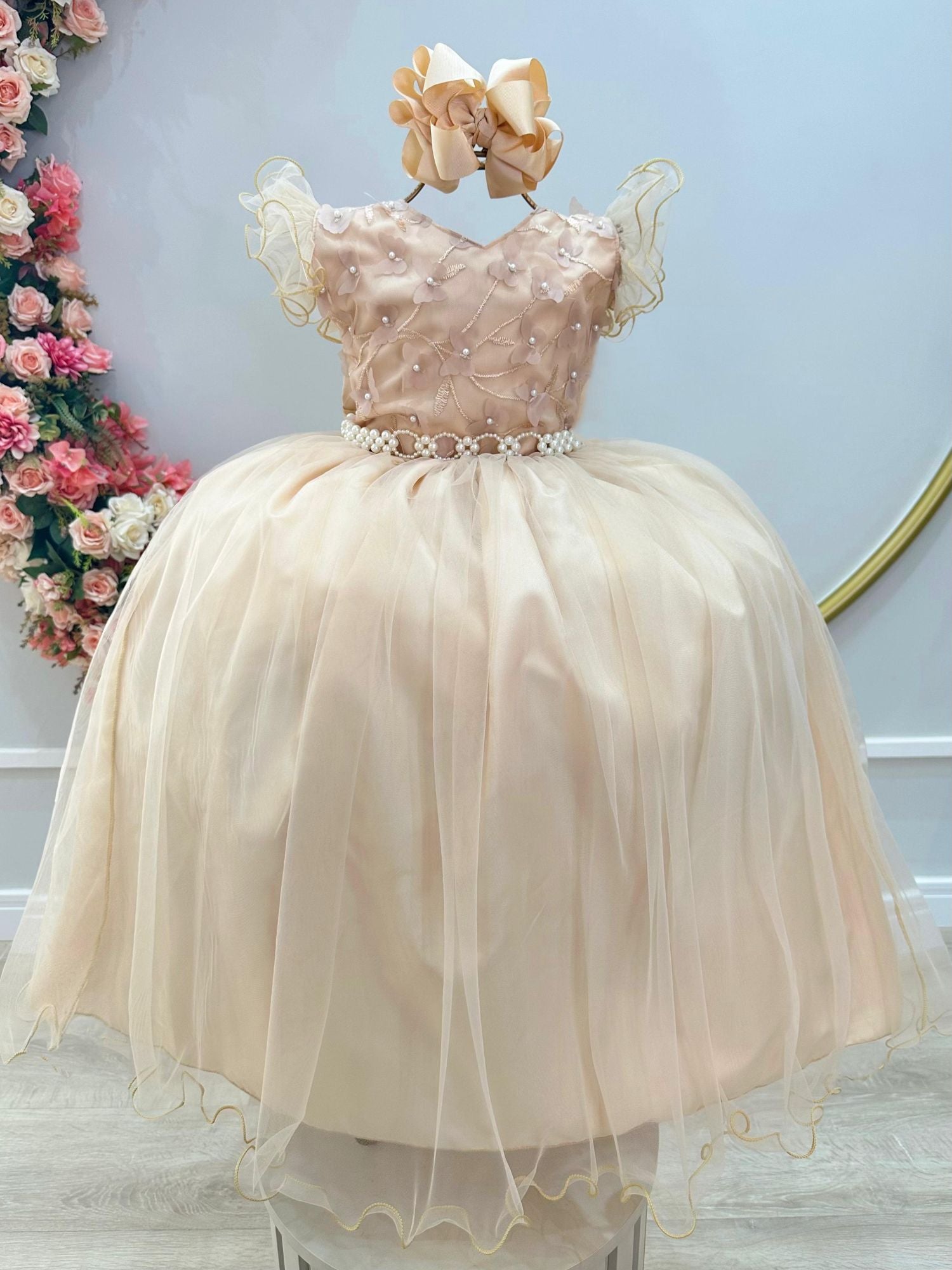Vestido Infantil Longo Dourado C/ Apliques e Renda Damas