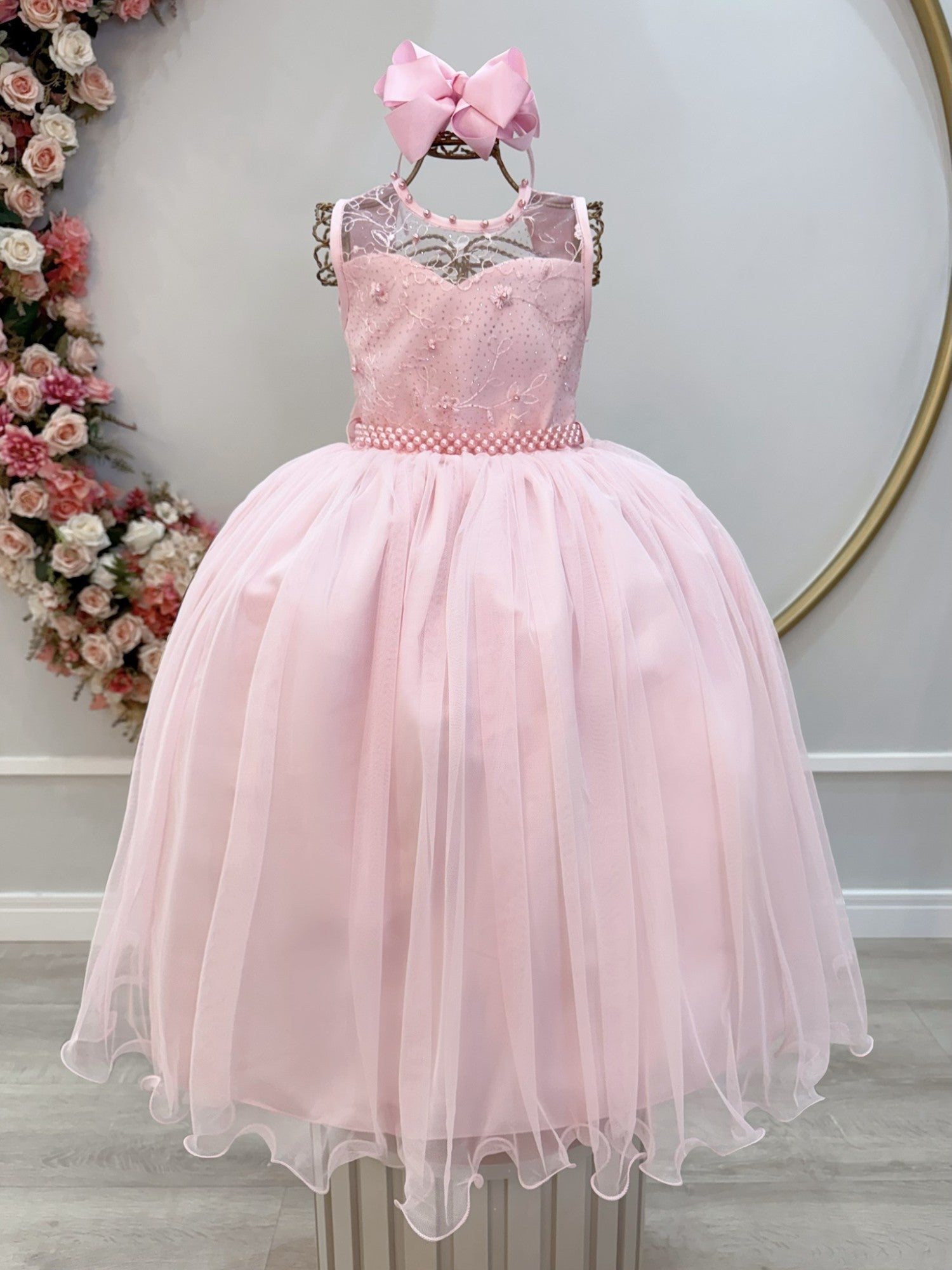 Vestido Infantil Longo Rosa Claro C/ Renda Casamentos Festas
