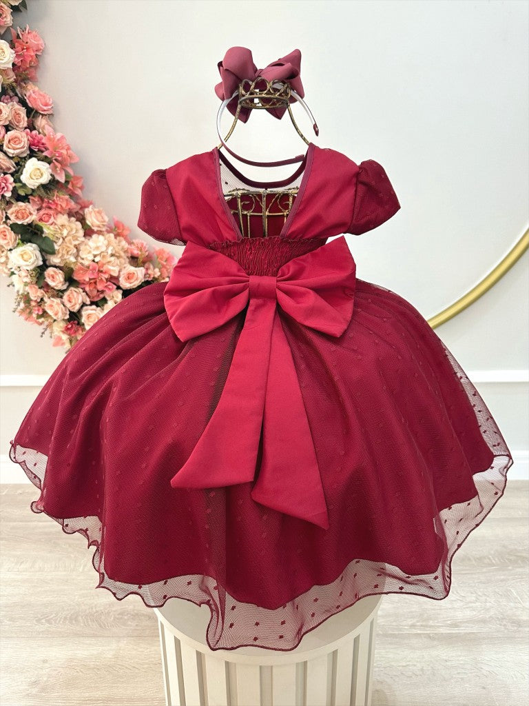 Vestido Infantil Marsala em Tule com Pérolas e Laço nas Costas para Festa de Aniversário