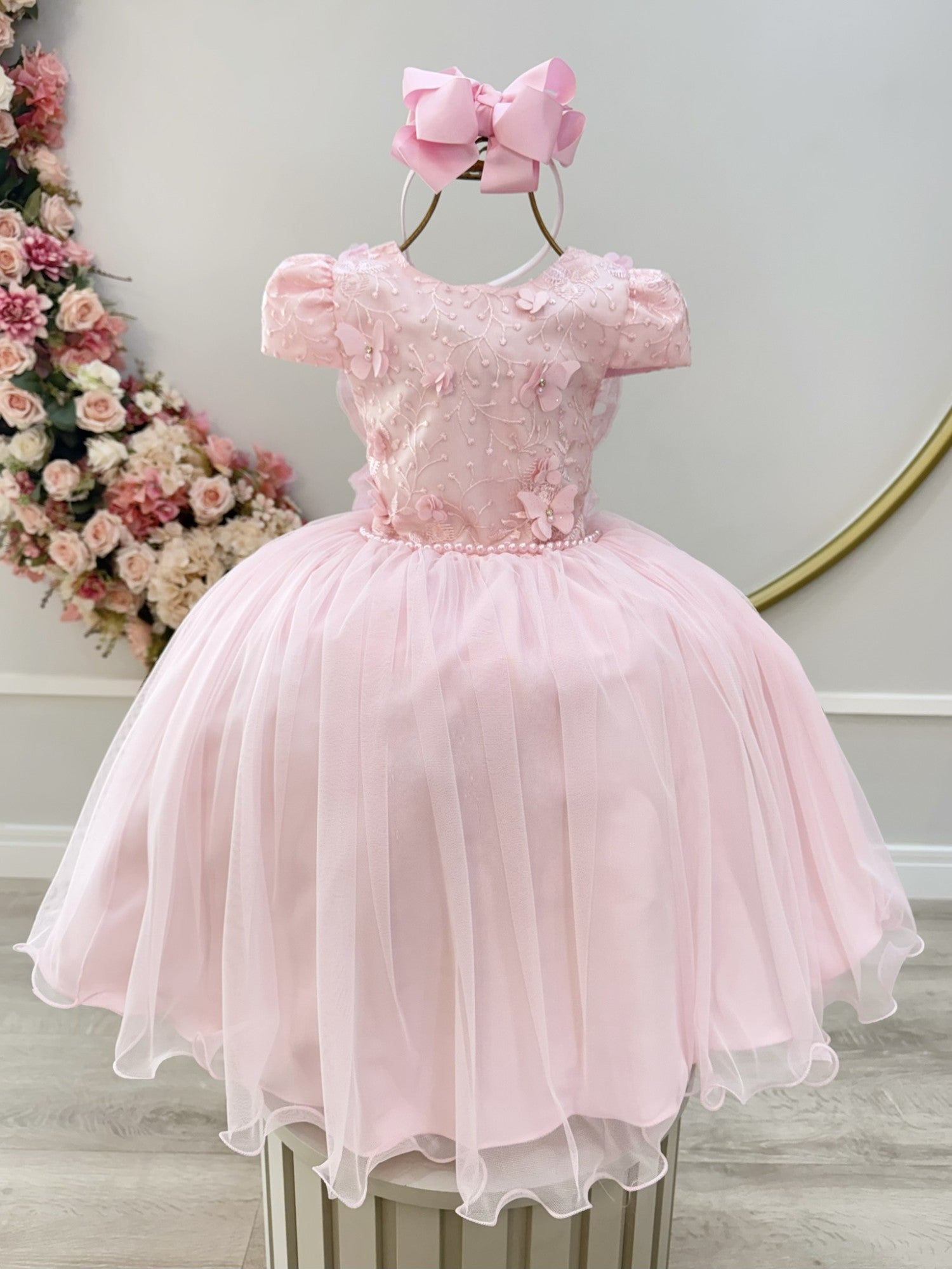 Vestido Infantil Rosa C/ Apliques Borboletas Festas Luxo
