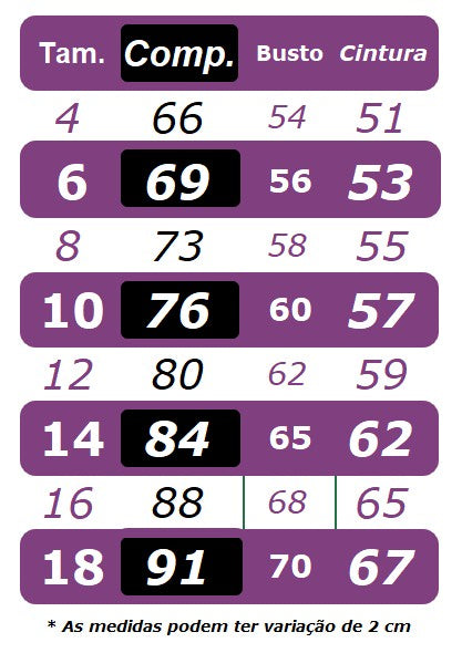 * Não é possível customizar as medidas, pois são padrão e a pronta entrega;