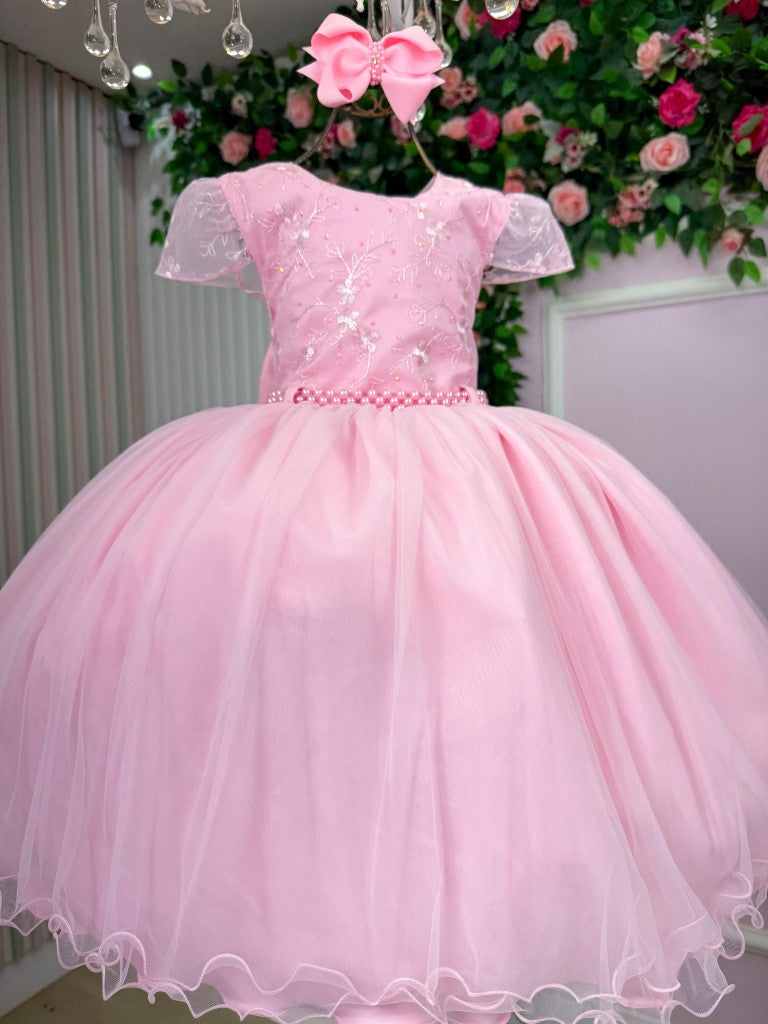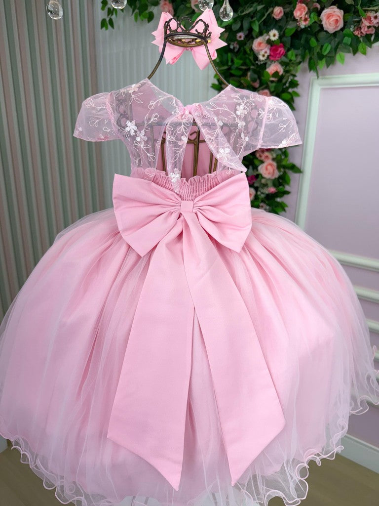 Vestido Infantil Rosa Claro em Tule com Laço Elegante para Daminhas