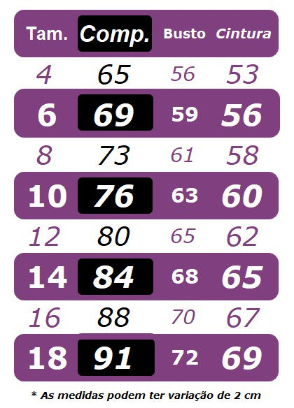 * Não é possível customizar as medidas, pois são padrão e a pronta entrega;
