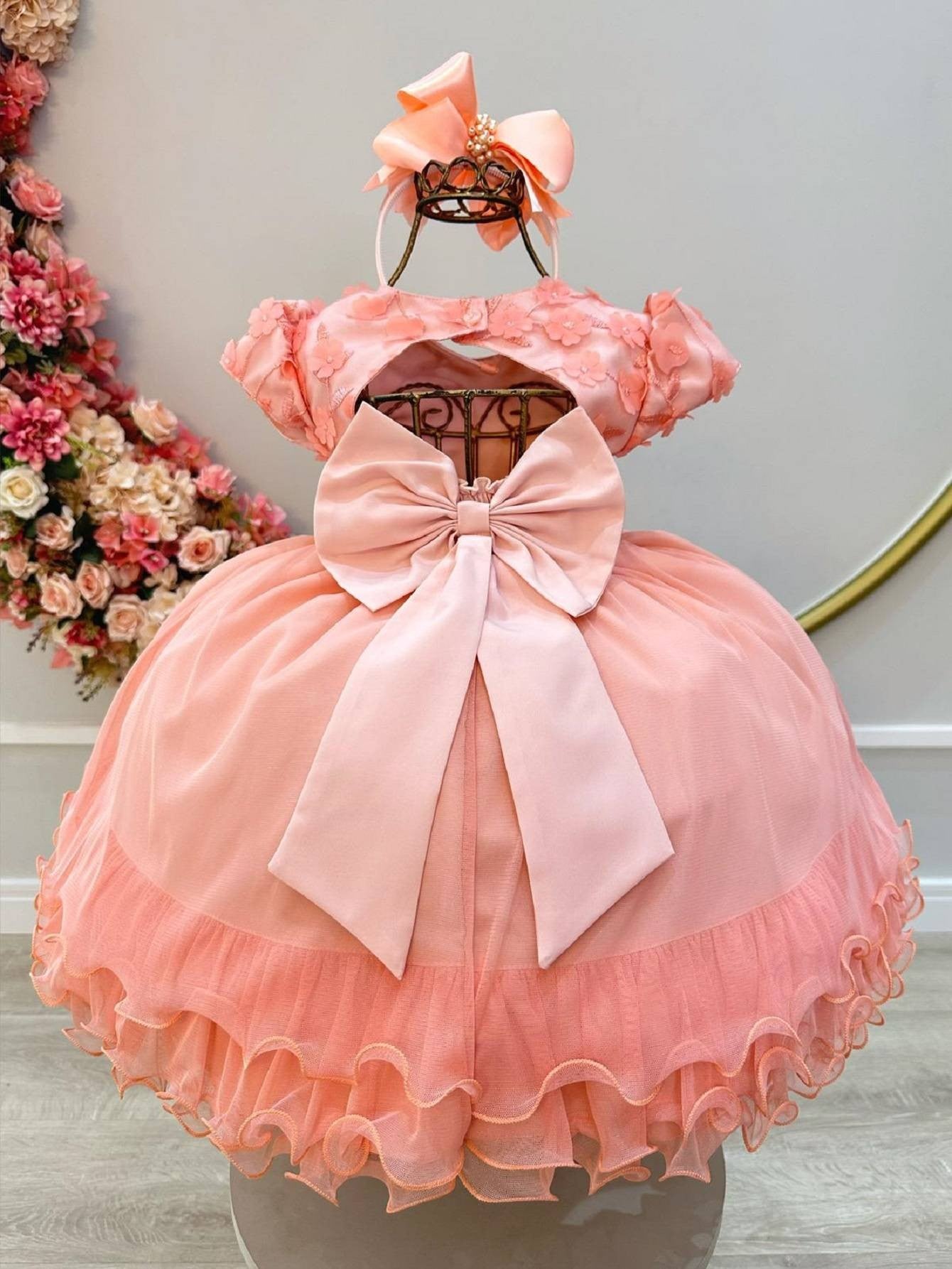 Vestido Infantil Salmão C/ Apliques de Flores e Renda Luxo