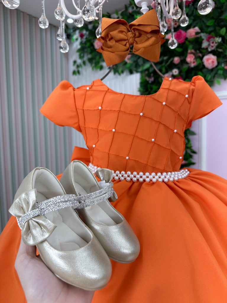Vestido Infantil Terracota em Poliéster com Pérolas e Gola