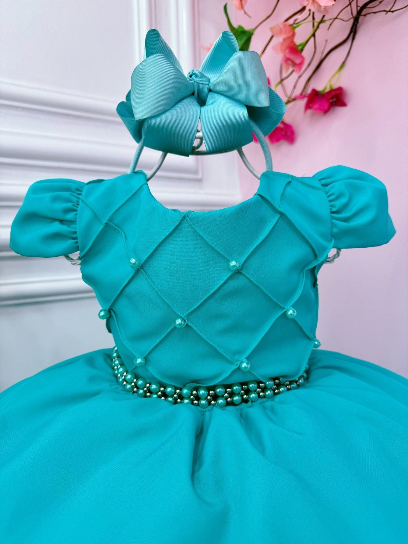 Vestido Infantil Verde em Cetim com Busto Nervura e Pérolas Luxo para Festa de Aniversário