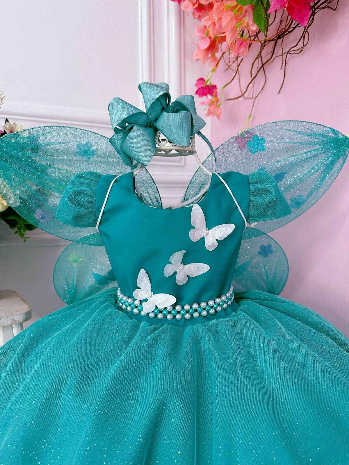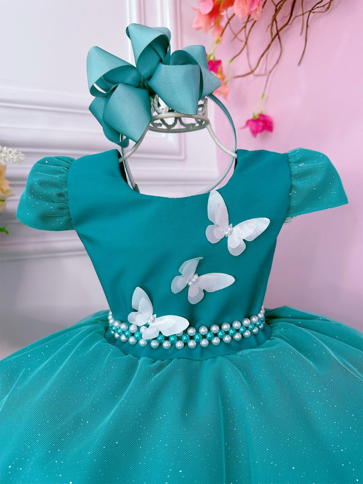 Vestido Infantil Verde em Glitter com Aplique de Borboletas e Saia Rodada para Festa de Aniversário