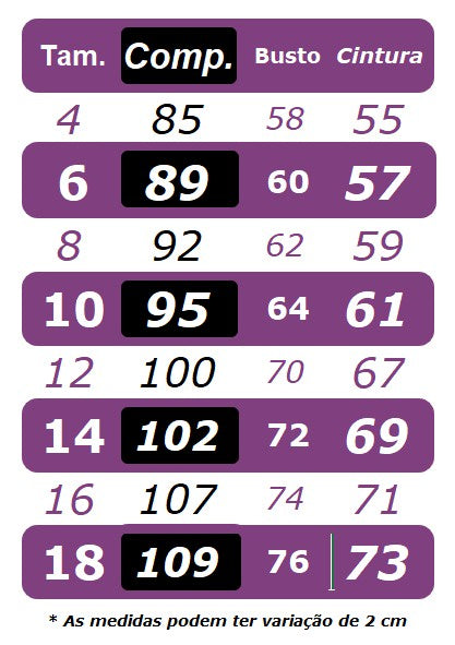 * Não é possível customizar as medidas, pois são padrão e a pronta entrega;