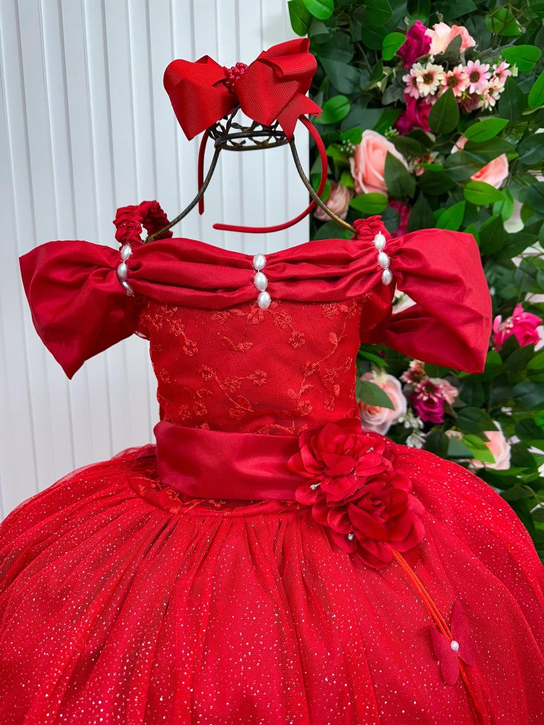 Vestido Infantil Vermelho em Tecido Misto com Manga Elegante para Estilo Princesa