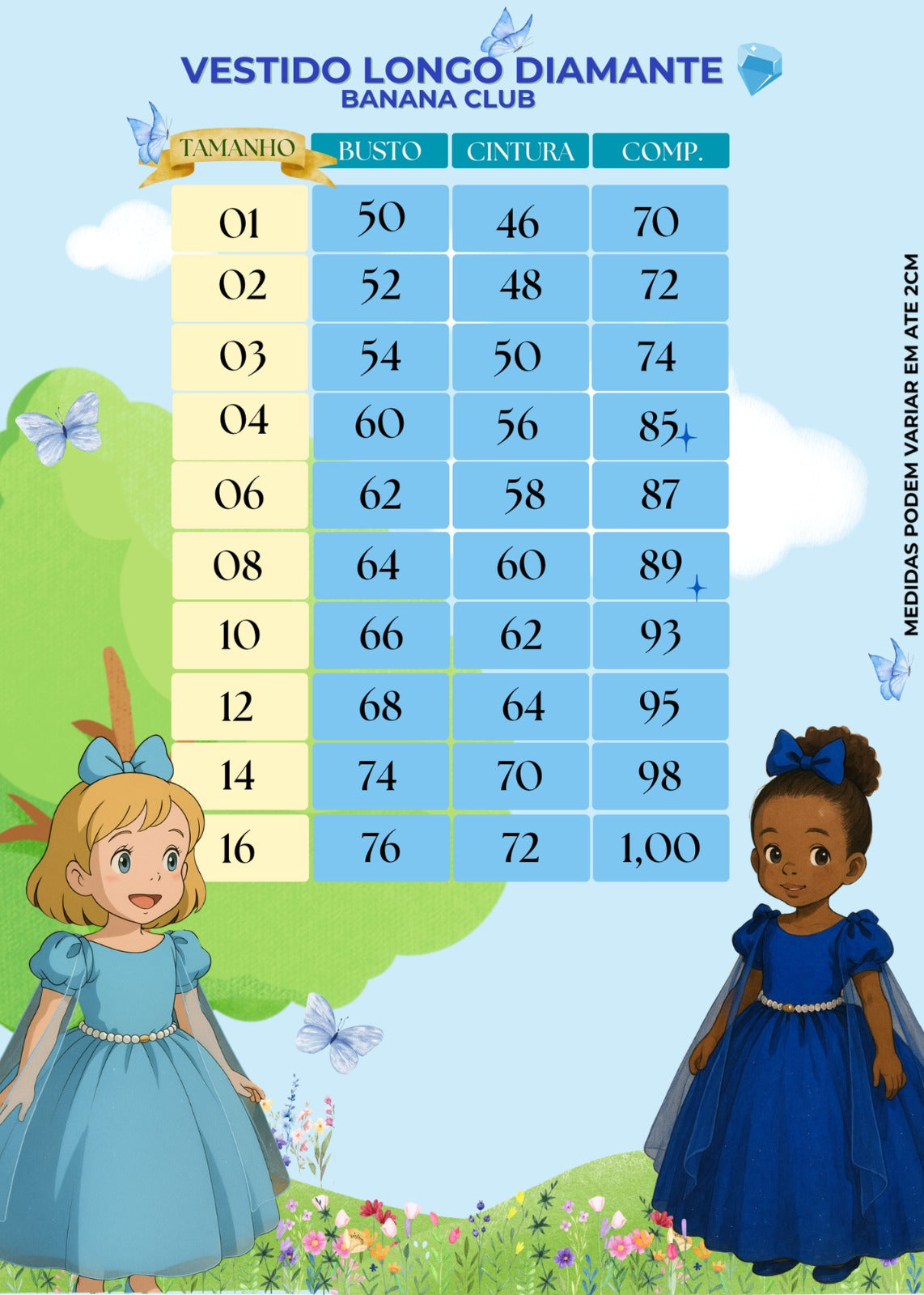 As medidas podem variar em até 2cm. Recomendamos sempre consultar a tabela de medidas antes da compra para evitar erros.