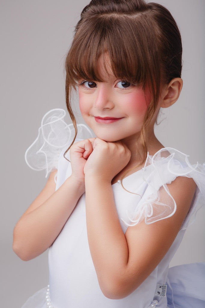 Confeccionado em tecido misto possui forro em poliéster e algodão para não incomodar a criança e proporcionando um caimento incrível e sofisticado, possui gola redonda,renda de flores e apliques de strass no peito, comprimento médio, mangas curtas, possui elástico nas costas para melhor ajuste, acabamento com lindo laço na parte posterior do vestido completa o look dos sonhos!